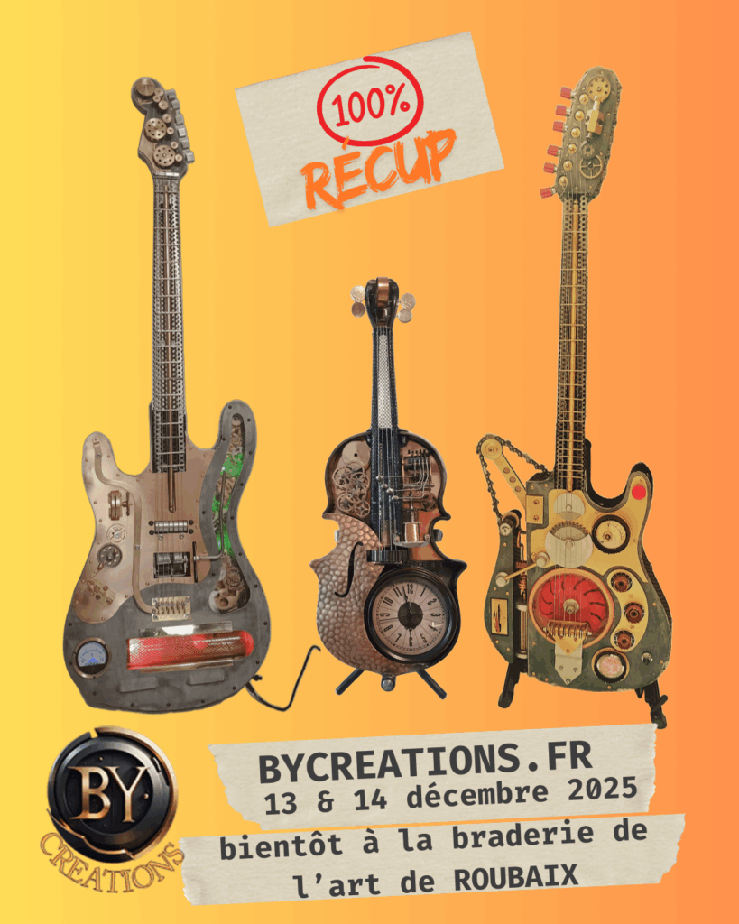 De plus, tout au long des 24 heures de la Braderie de l’Art Roubaix, je vais créer directement sur place en utilisant les éléments trouvés dans l’hyper stock. Cela me permet d’intégrer immédiatement le recyclage et l’inspiration collective dans chacune de mes œuvres.